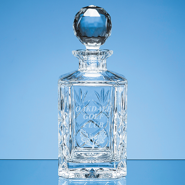 The elegant Gallery square spirit decanter is beautifully crafted out of 24% lead crystal and has a traditional diamond cut pattern hand cut and polished on 3 sides leaving 1 side plain for engraving. The plain side has the benefit of a large engraving area that can be personalised with any crest, logo or wording to create a gift that is sure to take pride of place when put on display at home or at work.