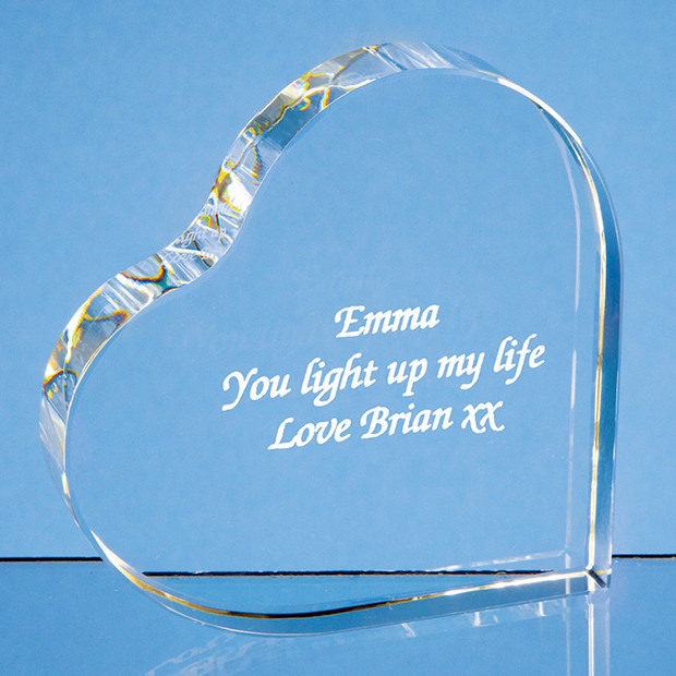 This optical crystal stand up heart is an ideal gift. It would be suitable as a wedding or anniversary gift or maybe for someone special on Valentines Day. It has a large engraving area that can be personalised with any logo, crest or wording.