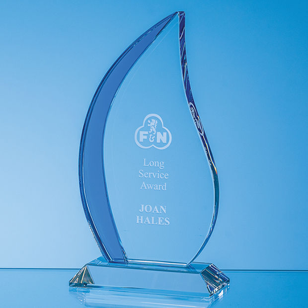The 20cm Optical Crystal Clear & Cobalt Blue Flame Award captures the essence of success and embodies accomplishment. It has a large engraving area that can be personalised with any logo or text required. This award is also available in 18cm. The award is supplied, as standard, in a foam lined gift box.