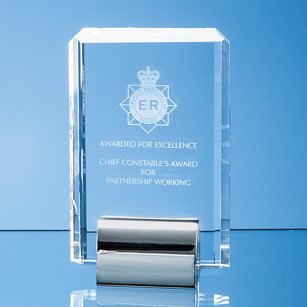 Stylish and ultra modern in appearance, the perfectly clear optic rectangles are mounted on a chrome plated base to create an exquisite recognition, achievement or incentive gift. This exciting new range of awards can be personalised with any crest, logo or wording to create an award that is sure to take pride of place when put on display at home or at work. They are available in 3 sizes and are supplied in a black foam lined presentation box.